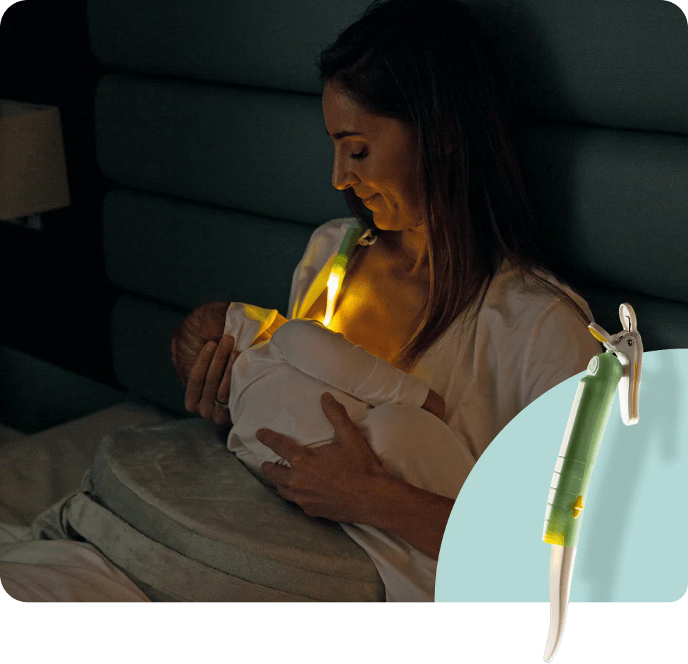LatchLight® geeft een zachte, gerichte gloed die de mond van je baby verlicht tijdens borst- of flesvoedingen, waardoor het gemakkelijker wordt om een goede hechting te bereiken terwijl iedereen in slaapstand blijft.